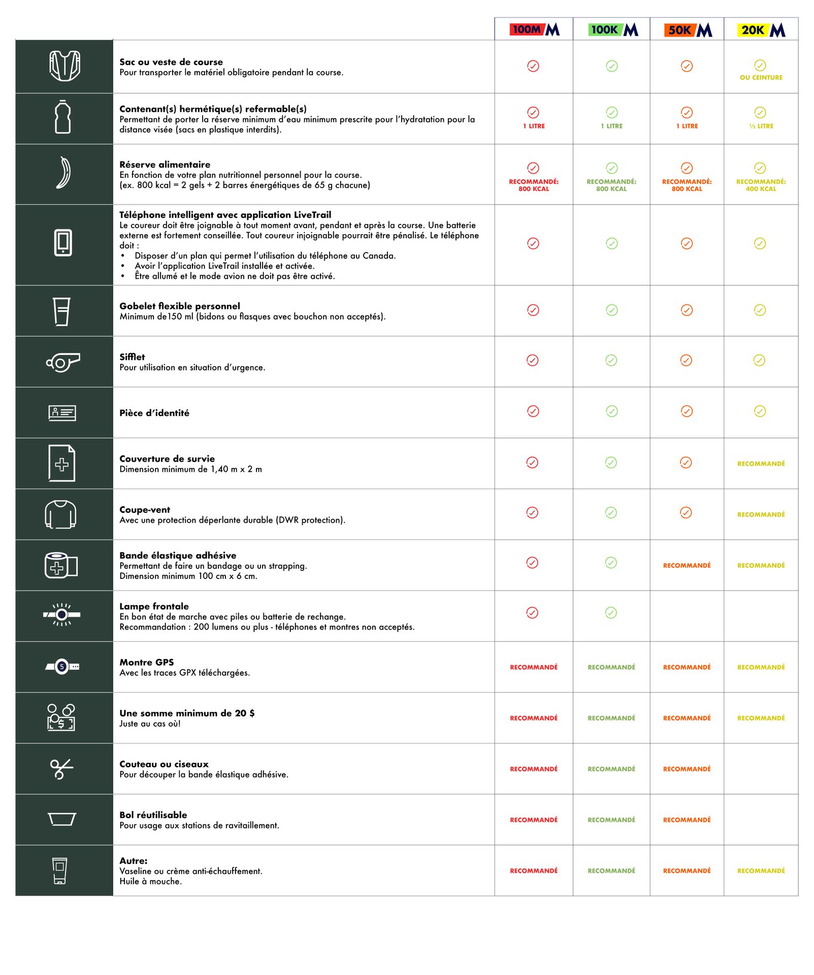 N’oubliez pas que le matériel demandé constitue une liste essentielle d’articles de base que chaque traileur doit adapter en fonction de ses propres capacités. Nous vous recommandons fortement de le tester lors de vos entraînements, dans différentes conditions, et de toujours emporter tout ce dont vous avez besoin.